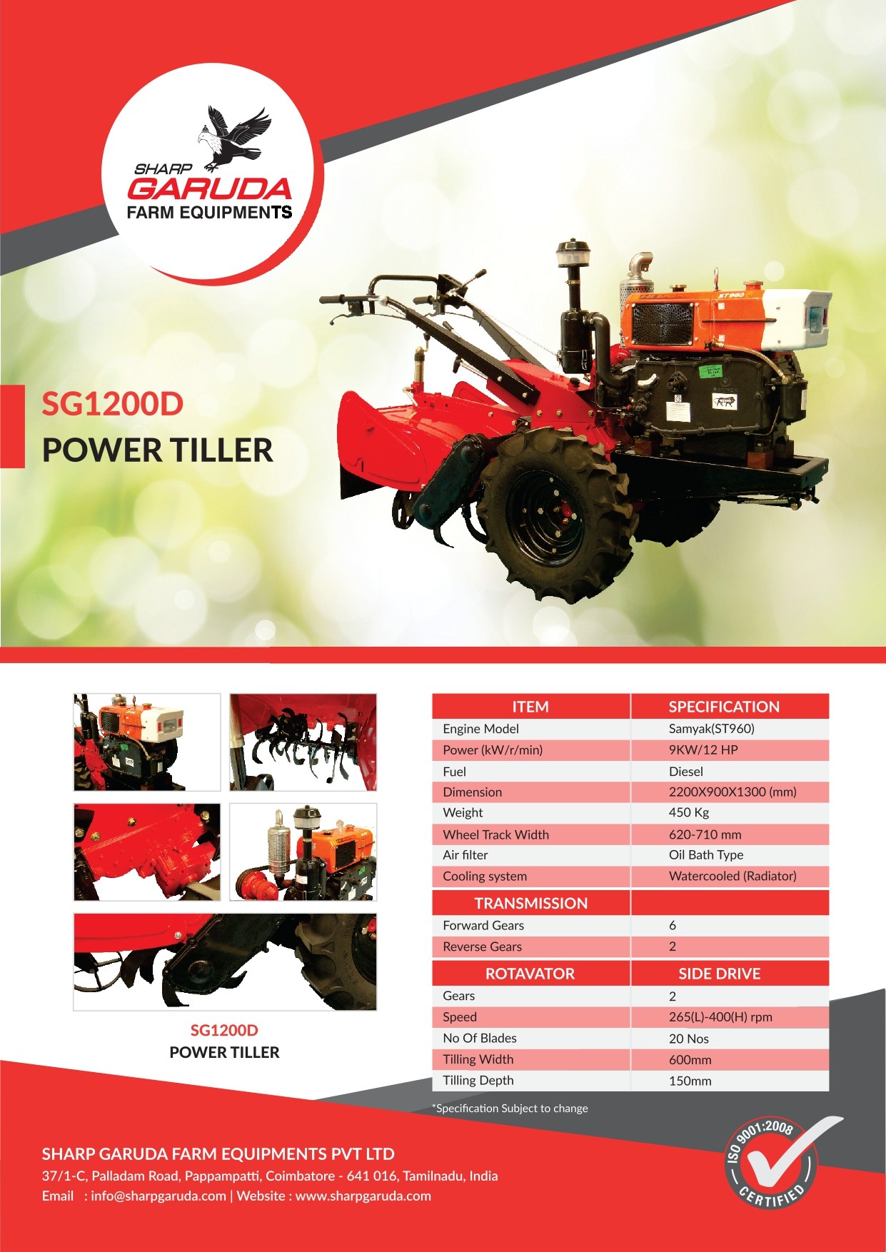 Power tiller: 12 H.P Diesel engine operated Number of blades: 12-18 Rotatory speed: 375rpm Transmission: 6Forward & 2 Reverse